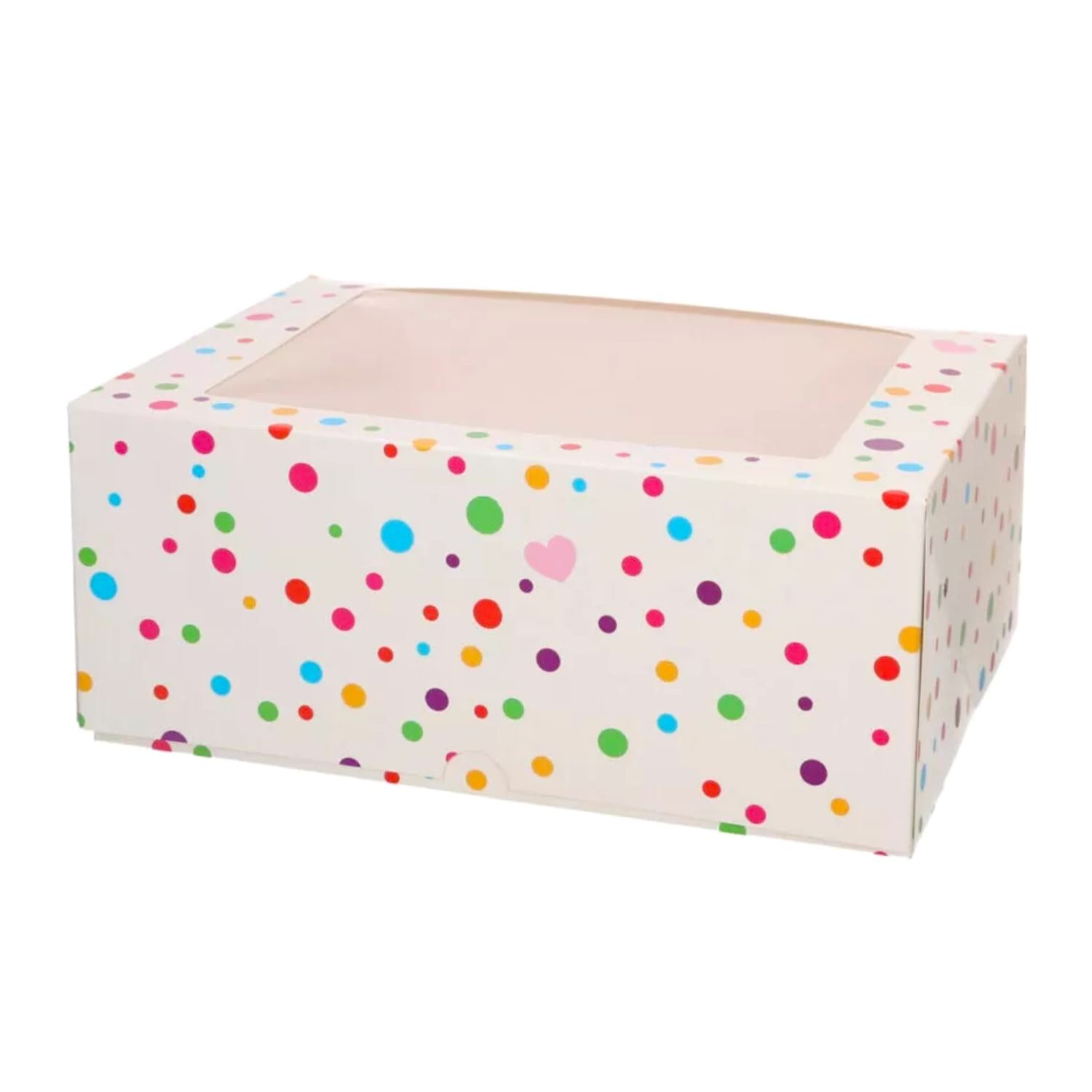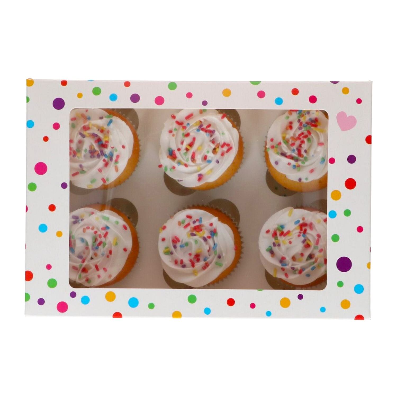 Caja de Funcakes para 6 cupcakes o 12 mini cupcakes, ahora con doble opción de bandejas internas para adaptarse a tus necesidades. La caja tiene un divertido y colorido diseño de confetti y una ventana de acetato transparente, lo que facilita la exhibición de tus creativos cupcakes o muffins, además de garantizar su protección durante el transporte.