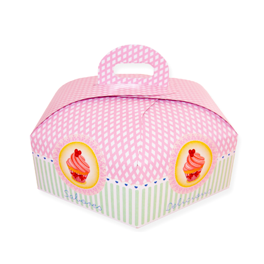 Práctica caja hexagonal con un bonito diseño en rosa y verde, con asa especial para transportar nuestros pasteles.