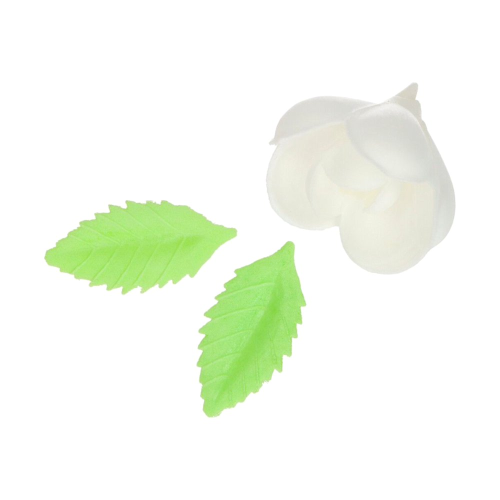 Incluye 12 flores comestibles de papel de oblea, con bonito diseño de Tulipán blanco y hojas verdes.