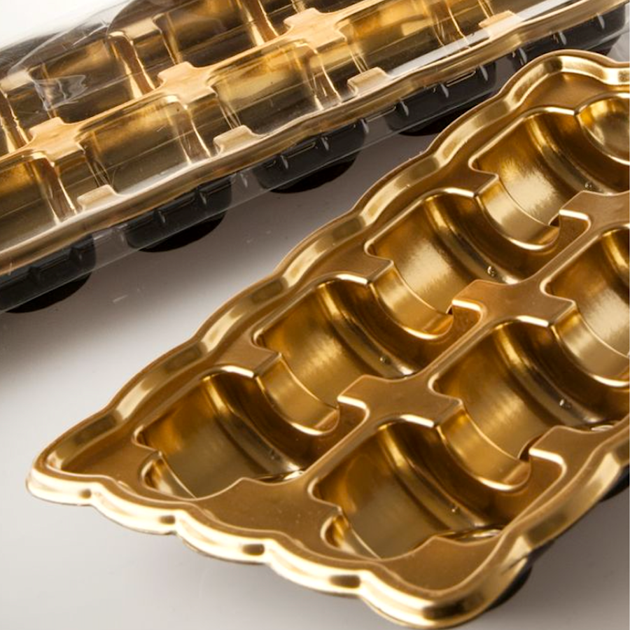 Incluye base color dorado brillante y tapa de plástico transparente, ideal para presentar y transportar nuestros macarons en perfecto estado.